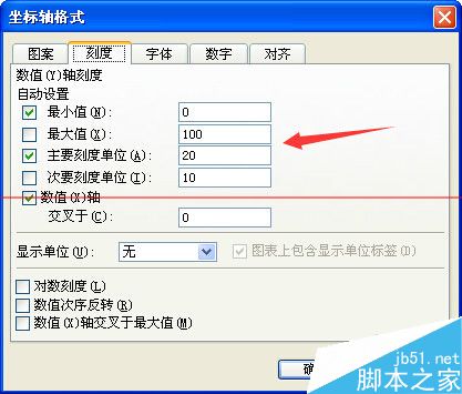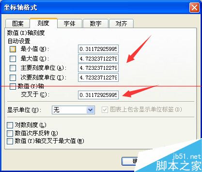 6、設置X坐標軸格式,選擇刻度選項卡,最小值及最大值中輸入最小及最大篩篩孔尺寸相應的POWER值,主要及次要刻度及交叉點分別輸最大篩孔及最小篩孔對應POWER值,如圖: