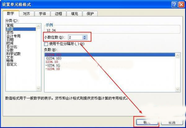 在“設置單元格格式”中選擇“數值”選項,在右側可以修改小數位數,修改完成后單擊“確定”按鈕。
