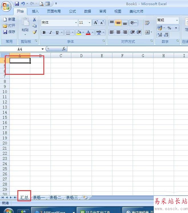 2、在表格的下面,重命名一個表格,我們暫且命名為“匯總”,然后選擇單元格中左上角的第一個單元格