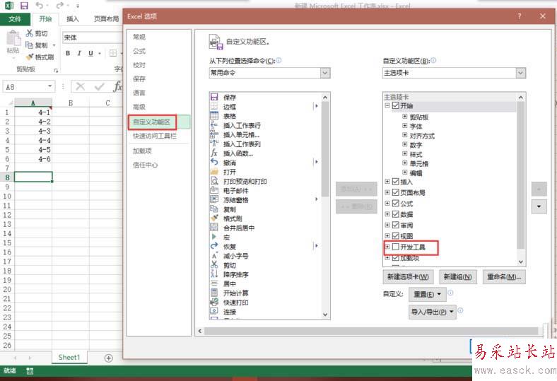 3、進入到選項中,我們點擊左邊的自定義功能區,將右邊的開發工具勾選上。