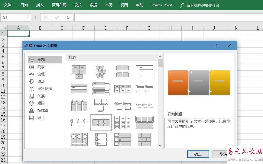 2、在彈出的SmartArt圖形選擇對話框中,選擇右側的“詳細流程”按鈕,然后,點擊“確認”按鈕。