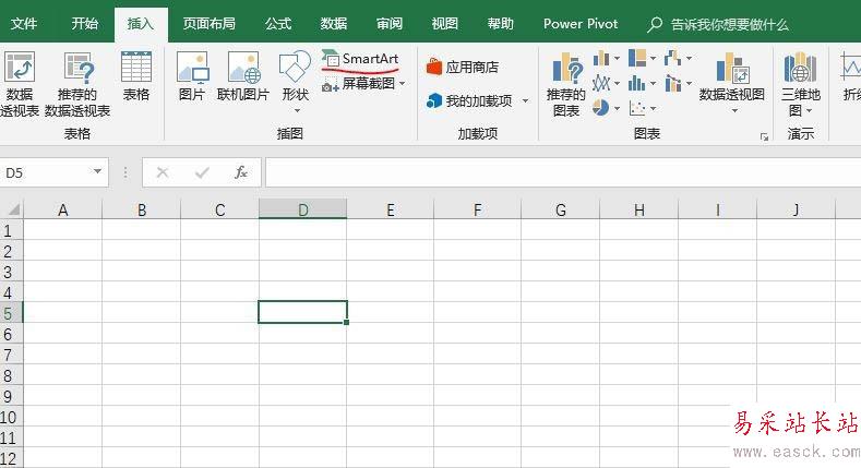1、在excel中,點擊“插入”菜單中的“SmartArt”按鈕。