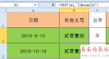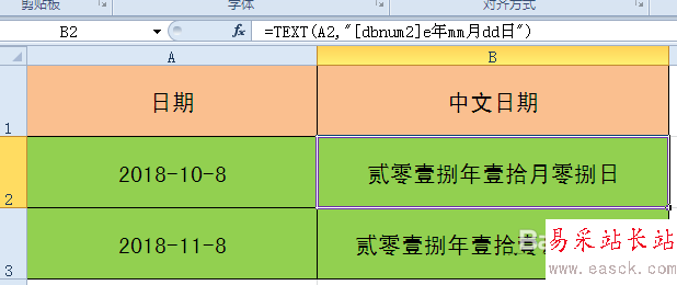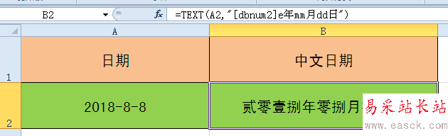 2、而“[dbnum2]”則是將數值轉換為中文大寫:=TEXT(A2,"[dbnum2]e年m月d日")