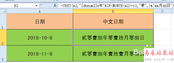 4、但當月份為“壹拾”時,前面也需要加“零”,因此要先判斷下月份是否為10,如果是,則要補充“零”,如果不是按原方式返回:=TEXT(A2,"[dbnum2]e年"&IF(MONTH(A2)=10,"零",)&"mm月dd日")