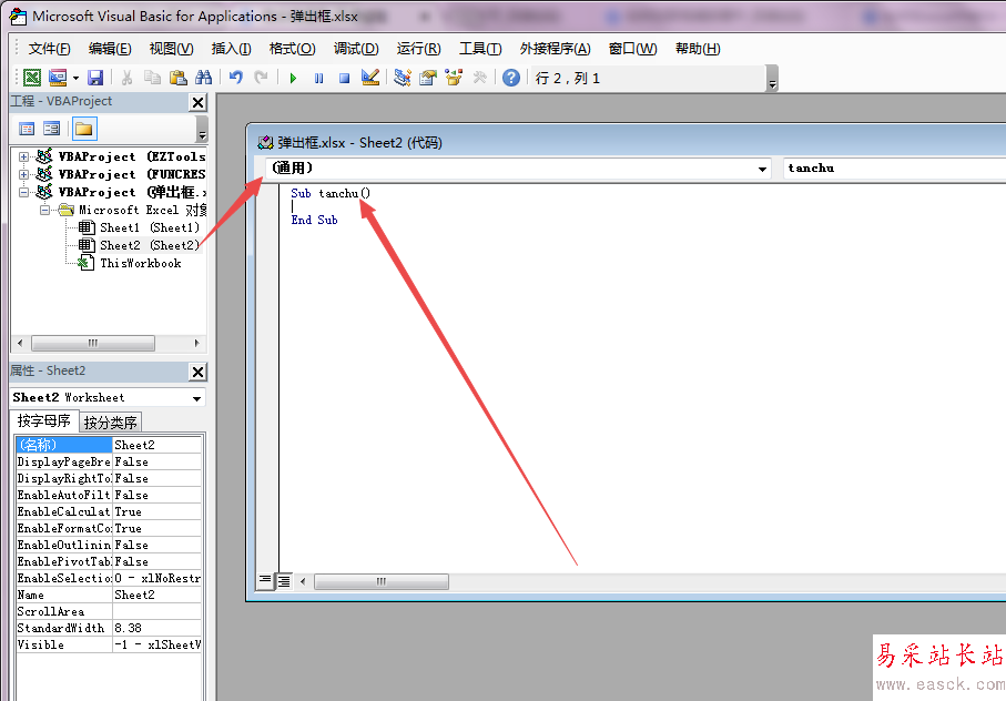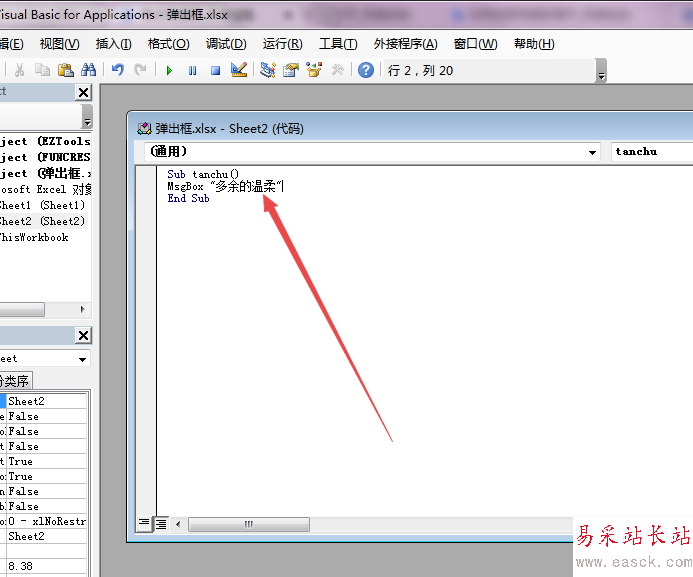 5、然后在彈出的空白頁面中輸入sub tanchu(),其中tanchu是一個名字,可以根據實際需要起,人、輸入之后完成之后,按下回車,它會自動補全結束代碼。