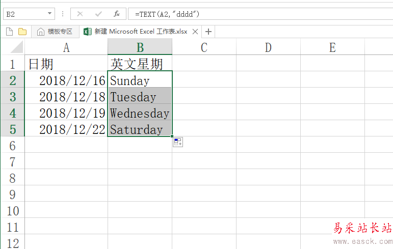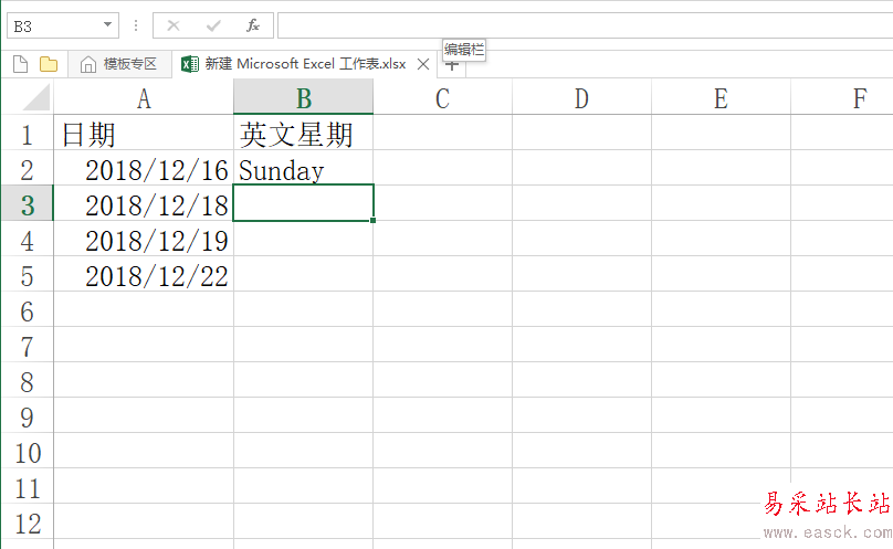 3、教程以下列日期為例,將其對應的英文星期放在右側單元格中。