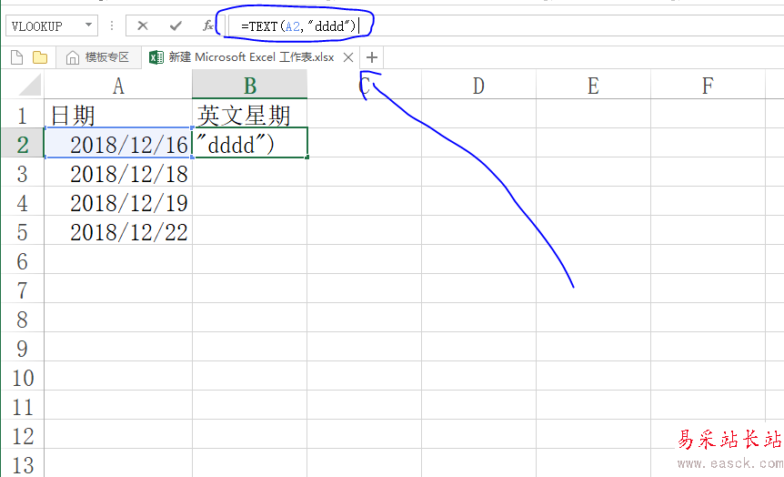 5、在編輯欄中復制粘貼以下函數公式:=TEXT(A2,"dddd"),然后按下Enter鍵進行確認即可。