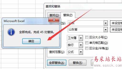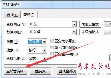 3、在打開的查找和替換窗口中,我們在查找內容處輸入山東,在替換為輸入山東省