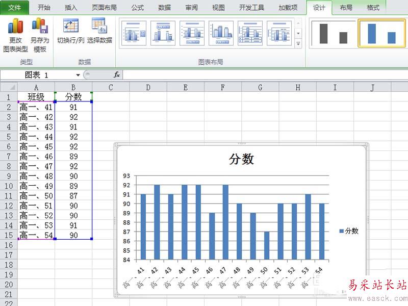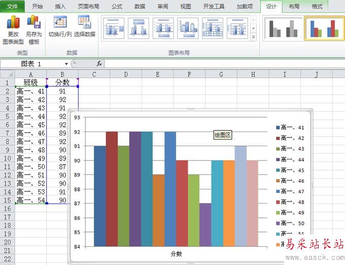 3、選擇圖表,在設(shè)計選項下點擊切換行列按鈕,接著每一個數(shù)據(jù)就變成了一個系列。