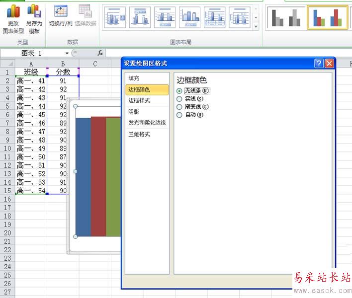 7、選擇圖表,在設(shè)置繪圖區(qū)格式中設(shè)置邊框顏色為無線條,設(shè)置完成后查看效果。