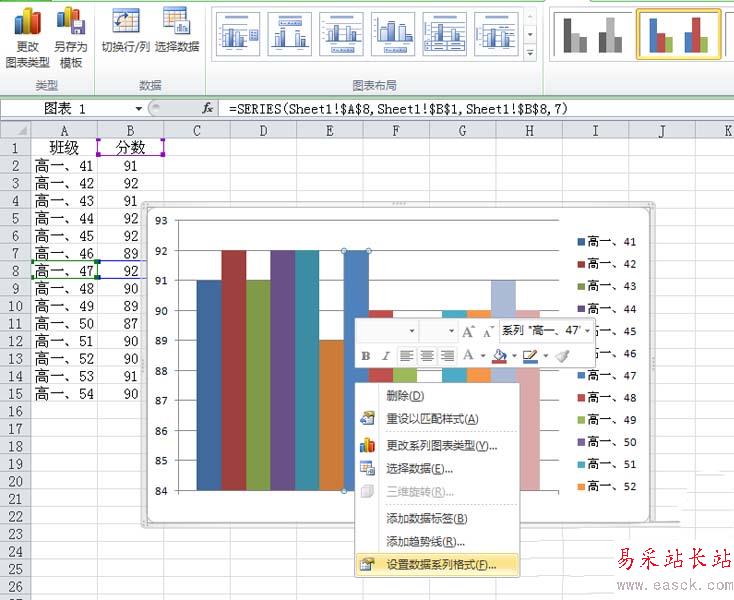 4、選擇其中一個柱子,右鍵單擊從下拉菜單中選擇設(shè)置數(shù)據(jù)系列格式選項,接著彈出設(shè)置系列格式對話框。