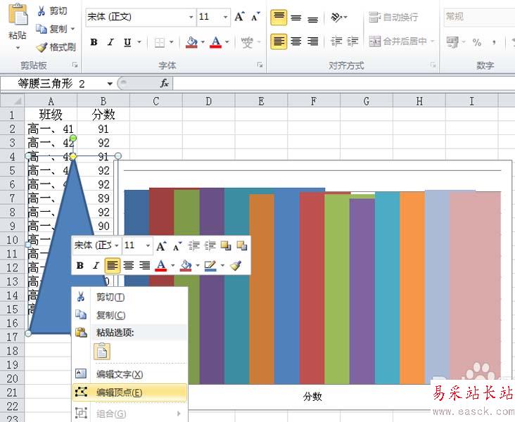 8、執(zhí)行插入-形狀-等腰三角形命令,在excel中繪制一個三角形,右鍵單擊該三角形,從下拉菜單中選擇編輯頂點選項。
