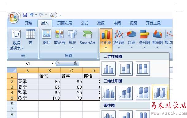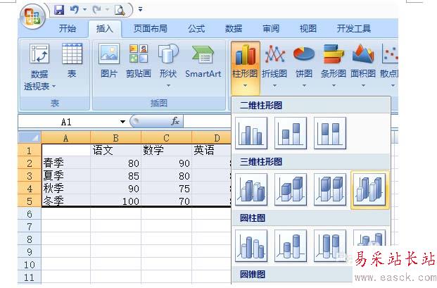 2、點擊菜單上--插入—柱狀圖,這里有個三維柱狀圖的選項,點擊最后一個。