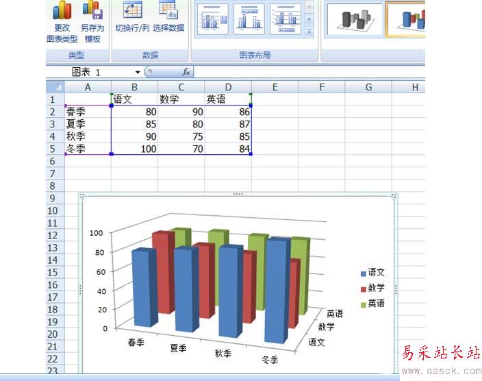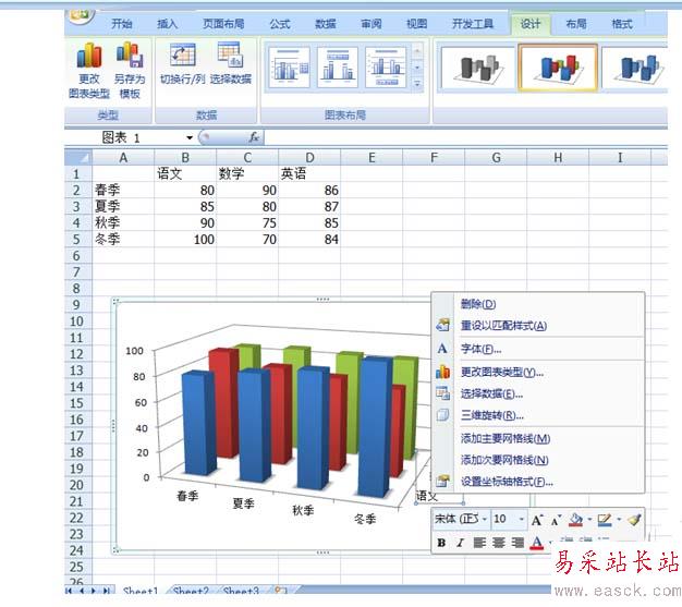6、此外,單機坐標軸上的文本后,還可以通過點擊—編輯數據選項。對圖標上的數據進行編輯。最終,一張三維柱狀圖就完成了,從這張圖,我們可以看出許多信息:比如:春季的時候,小明成績最好的數學。一年下來,小明的英語成績不變。