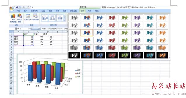 4、點擊柱狀圖上的彩色柱塊,然后點擊設計,會彈出許多模板,利用他們可以調節柱條的顏色搭配。