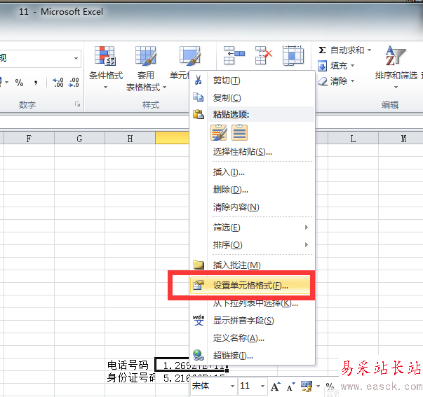 2、然后我們在產(chǎn)生亂碼的單元格上右鍵點擊選擇“設(shè)置單元格格式”。