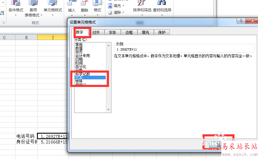 3、在打開的對話框中“數(shù)字”下選擇“文本”選項點擊確定。