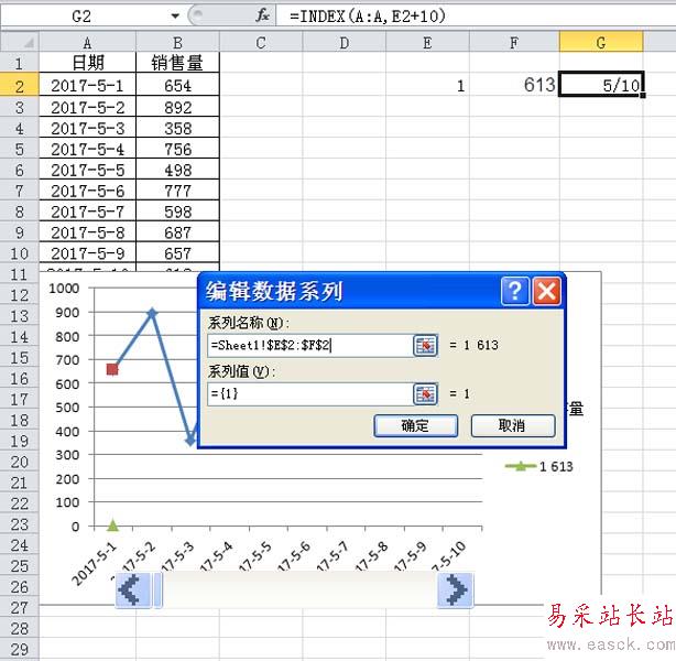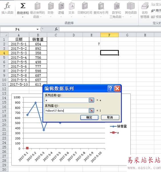 2、執行插入-折線圖命令,這樣就插入了一個折線圖,選擇單元格e2并輸入7,執行公式-定義名稱命令,在彈出的對話框中輸入名稱為date,引用位置設置為,點擊確定按鈕。