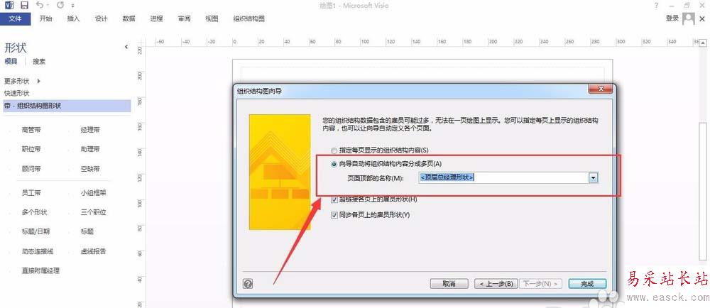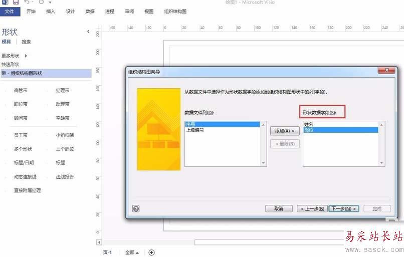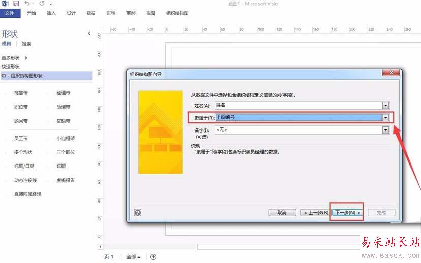 8、數據文件列選擇”上級編號“,顯示字段設置為”姓名“,形狀數據字段設置為”崗位“,點擊”下一步“。