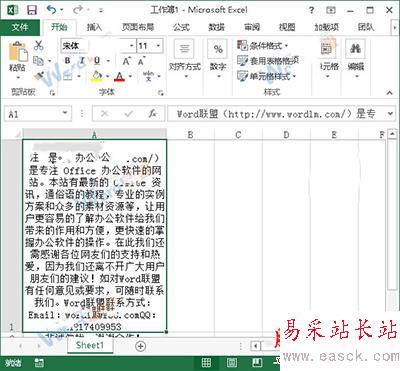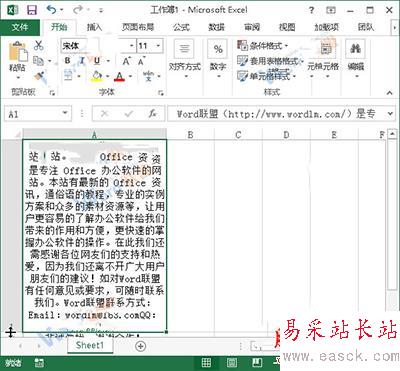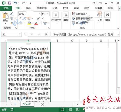 1、用Excel2013打開一篇含有長文本的工作表,如圖所示,我們現在要對A1單元格中的文本內容進行排版。將鼠標移動到A列單元格的右邊邊線上,待指針變成雙向箭頭的時候按下鼠標并向右拖動,給A列單元格一個合適的列寬。