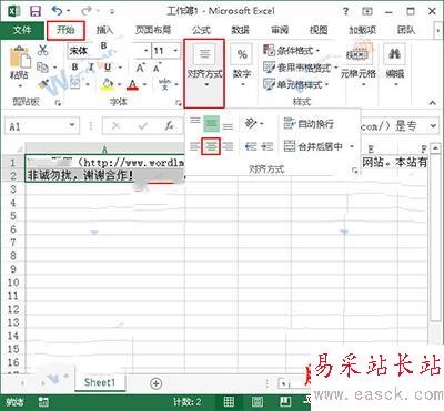 2、我們現在選中A1和A2單元格,然后切換到“開始”選項卡,單擊“對齊方式”組中的“居中”按鈕,使文本能夠水平居中。