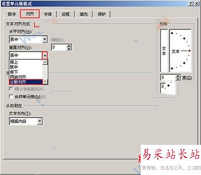 5、此時會彈出一個“設置單元格格式”對話框,我們切換到“對齊”選項卡,然后單擊“垂直對齊”下拉框右側的按鈕,選擇“分散對齊”選項,最后單擊“確定”按鈕即可。