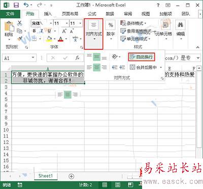 3、現在,我們單擊“對齊方式”組中的“自動換行”按鈕,讓我們能夠看清A1單元格中的所有內容。