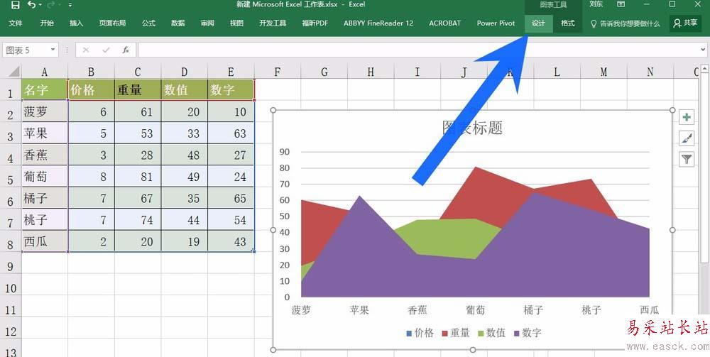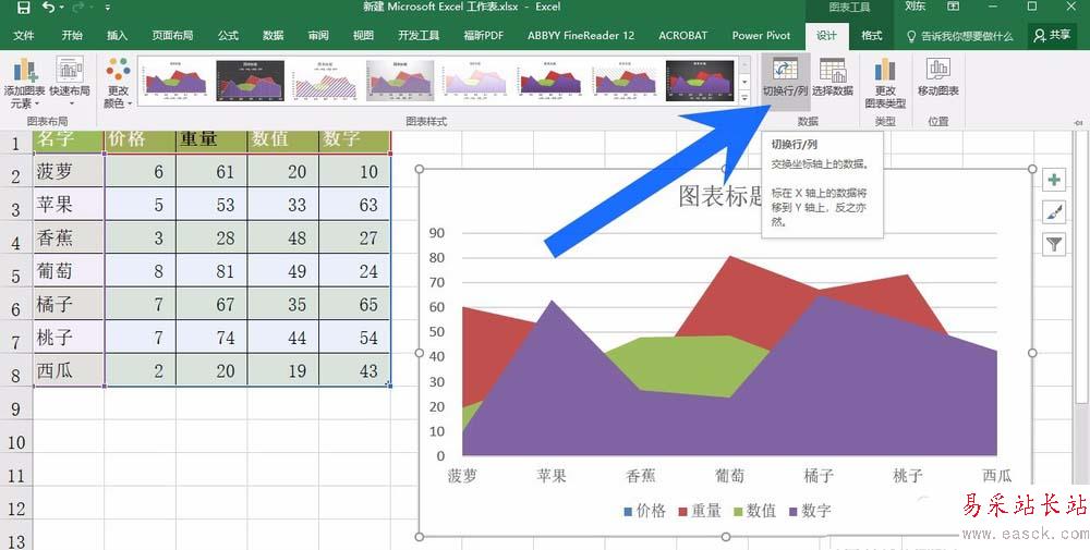 3、在設計選項卡選項,我們找到切換行和列的功能,點擊一下