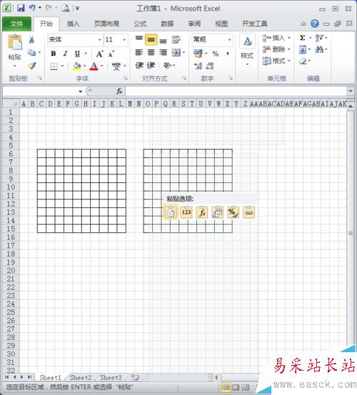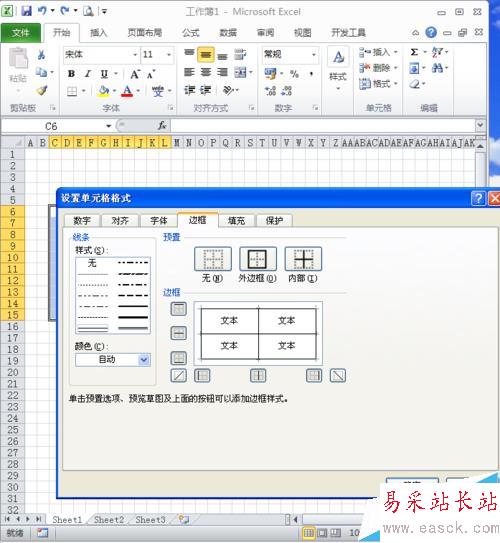 4、設置完畢,會出現畫布,在畫布里畫上方框,方法:選中一個“10×10”的單元格,右鍵單機,選擇“設置單元格格式”,在出現的單元格格式對話框里,選擇“邊框”-選擇“外邊框”和“內邊框”,點擊“確定”