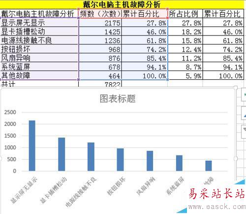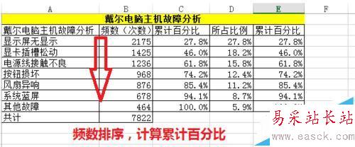 如圖所示,頻數排序,計算累計百分比。圖表制作使用前3列數據。