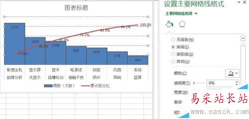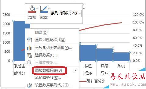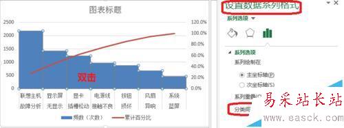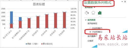 2、點擊圖表工具(格式)——系列“累計百分比”——設置所選內容格式——次坐標軸。