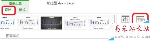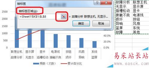 4、點擊圖表工具(設計)——選擇數據——軸標簽區域(如圖所示,把原來的拆分成兩列,是柏拉圖的橫坐標軸的數據顯示如圖所示)