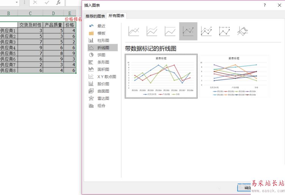 2、單擊插入圖表,選擇插入折線圖(不要以為錯誤,這是為了畫出帶有輻射線的雷達圖),單擊確定。