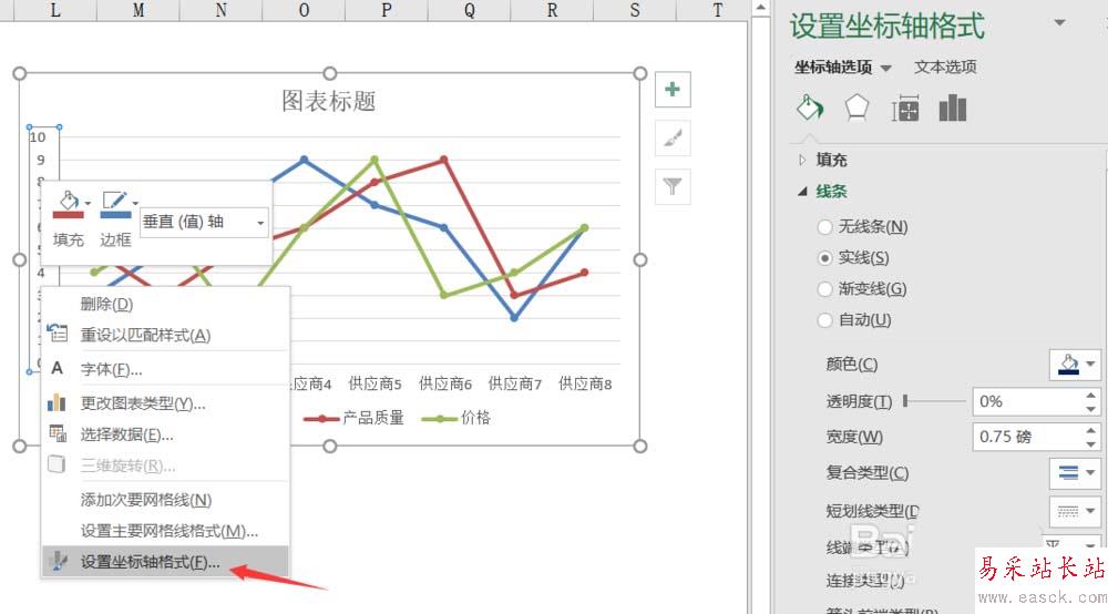 3、將橫縱坐標軸設為實線,如圖,右鍵單擊橫(縱)坐標軸數據,單擊選項欄中“設置坐標軸格式”,右側彈出設置區域,如圖單擊線條——實線。即可,縱軸同理即可。