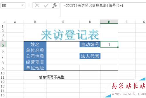 5、輸入公式=COUNT(來訪登記信息總表[編號])+1,實現自動編號。