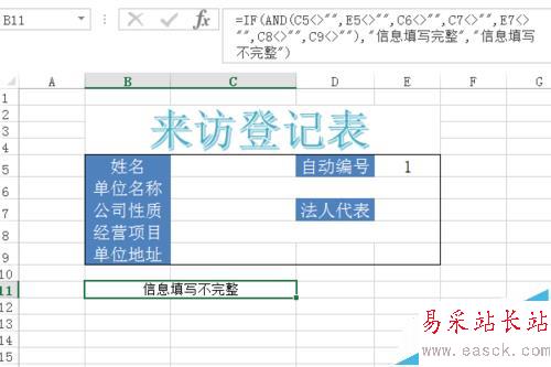 6、輸入IF函數判斷填寫是否完整。=IF(AND(C5<>"",E5<>"",C6<>"",C7<>"",E7<>"",C8<>"",C9<>""),"信息填寫完整","信息填寫不完整"),<>表示單元格有數據,""表示單元格為空白。