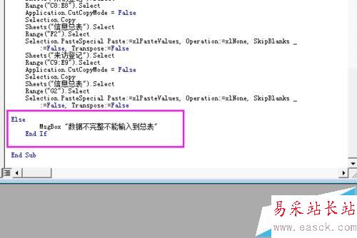 11、在開頭,輸入如下語句:If Range("B10").Text = "信息填寫完整" Then