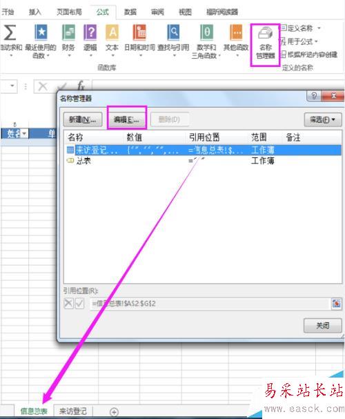 4、公式-名稱管理器,可以管理編輯表的名稱。方便跨表引用。這里編輯表名稱為“來訪登記信息總表”。
