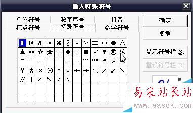 一些常用的“數學符號”、“數字序號”等特殊符號,軟件內置了一個“特殊符號”功能,可以直接調用插入:切換到“插入”菜單選項卡中,單擊“特殊符號”按鈕,在隨后出現的下拉列表中,選擇相應的特殊符號將其輸入到單元格中,如果需要的符號不在上述列表中,請單擊其中的“更多”選項,打開“插入特殊符號”對話框,切換到相應的選項卡,雙擊相應的符號,將其輸入到單元格,并關閉對話框返回,如下圖所示。