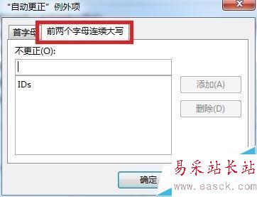7、在彈出的例外項對話框中。點擊”前兩個字母連續大小寫“選項,在下面輸入要添加的排除的特定單詞,確定即可。最后,回到工作界面,你可以自己測試一下剛才設置的效果。