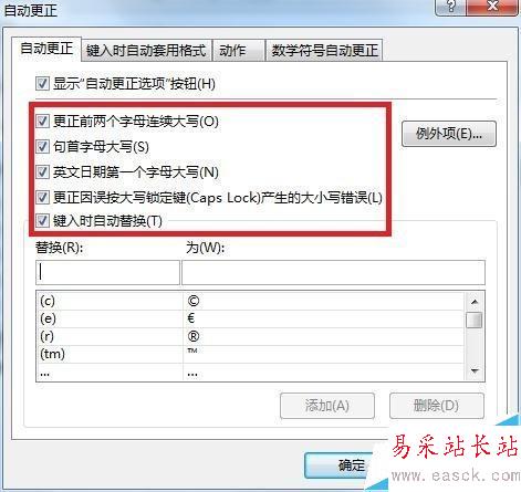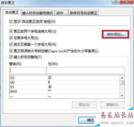 6、但是有時候我們輸入的前兩個字母都要大寫的時候,系統可能會將其更正為第一個大寫而第二個小寫,那要怎么排出這種情況呢?點擊右邊的”例外項“。