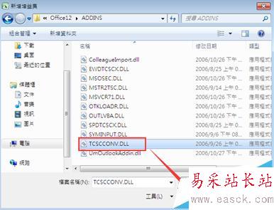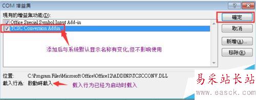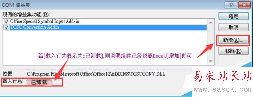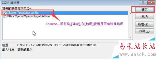 4、在【Chinese Translation Addin】打鉤依然無效的情況下,留意該項(xiàng)的載入行為是否已經(jīng)為已卸載狀態(tài),若顯示為卸載則需要重新【新增】上,路徑:C:/Program Files/Microsoft Office/Office12/ADDINS 中TCSCCONV.DLL,很好尋找(若該路徑?jīng)]有TCSCCONV.DLL,則在其他電腦室進(jìn)行拷貝或在網(wǎng)上下載一個(gè)存放在目錄即可)