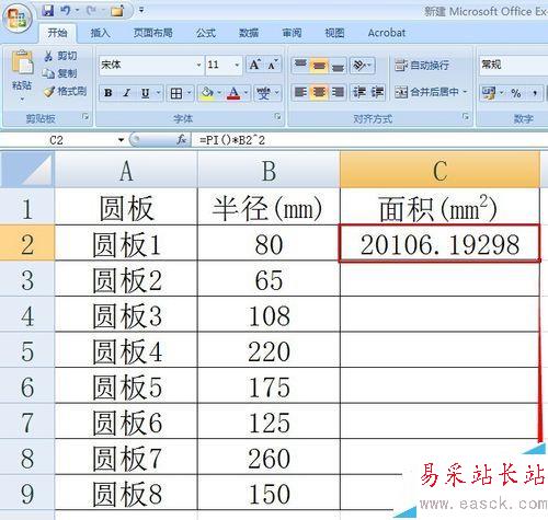 2、在C2單元格中輸入公式“=PI()*B2^2”,下面,分步介紹這個(gè)公式的含義。