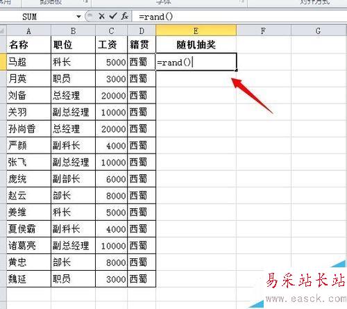2、接下來我們在這15個人中隨機抽取5個人作為幸運員工。點擊表格E1單元格,新建名稱為隨機抽獎,然后在E2中輸入公式=rand()