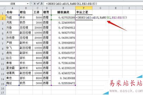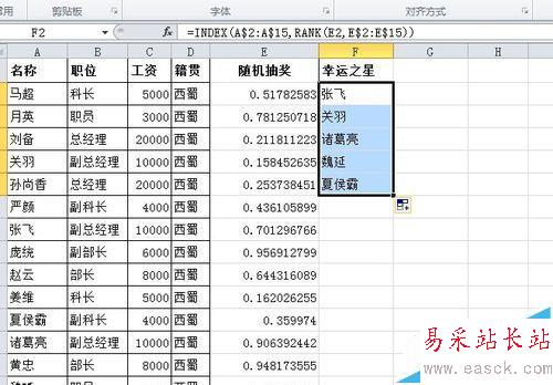 4、點擊選擇F1單元格,新建名稱為幸運之星,然后在F2單元格輸入公式=INDEX(A$2:A$15,RANK(E2,E$2:E$15))