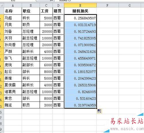 5、點擊F2單元格快速填充按鈕,向下復制5個單元格作為抽出的5個幸運員工。