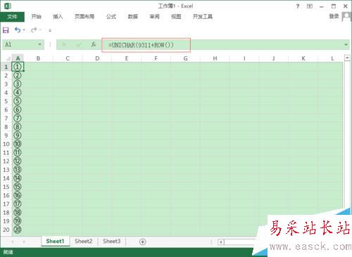 2、在A1單元格輸入公式=UNICHAR(9311+ROW()),然后拖住填充柄往下拖拉即可。