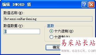 3、右鍵ExtensionHardening,點擊修改,然后輸入值為0。點擊上面菜單中的退出即可。