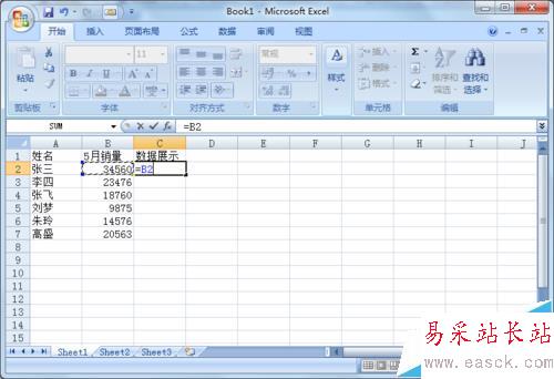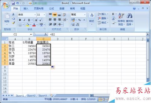 2、把表格B列的數(shù)據(jù),填充到C列。在C2輸入公式=B2,回車,然后直接把鼠放在單元格右下角呈黑色十字以后向下拖動(dòng)自動(dòng)填充。