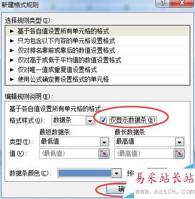 7、在數(shù)據(jù)條規(guī)則設(shè)置對(duì)話框勾選僅顯示數(shù)據(jù)條。數(shù)據(jù)條的顏色也可以進(jìn)行設(shè)置,在這里就默認(rèn)的了。設(shè)置完成以后點(diǎn)擊確定。